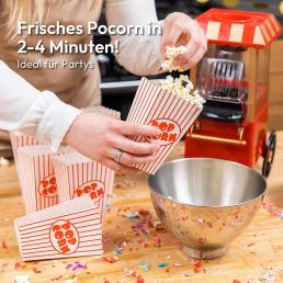 Mit unserer Popcornmaschine wird das Popcornmachen zum Kinderspiel. Du musst keine komplizierten Vorbereitungen treffen oder auf unhandliche Popcornbeutel zurückgreifen. Einfach Popcornkörner in die Maschine füllen, den Einschaltknopf drücken und schon nach wenigen Minuten kannst du das frische Popcorn genießen.